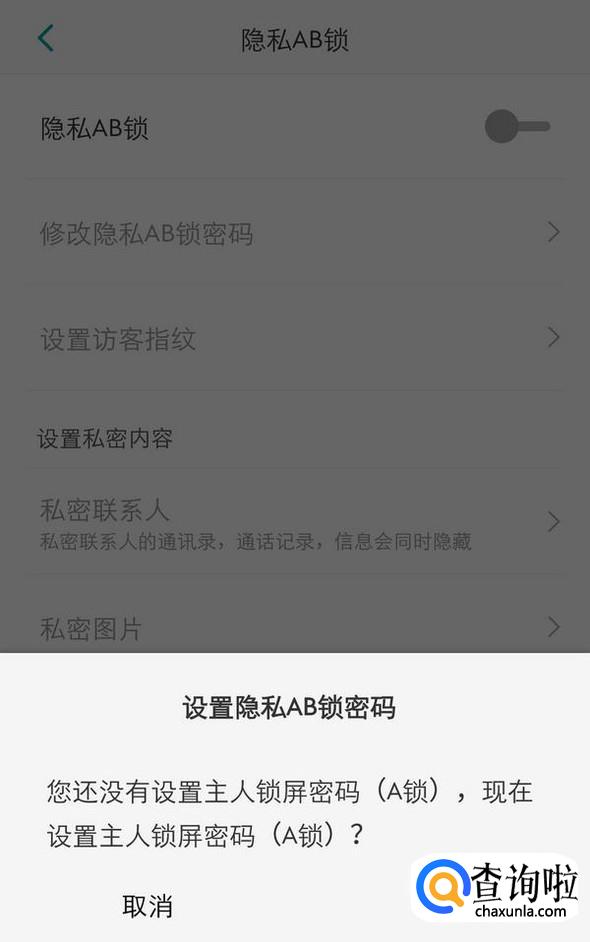 设置的时候有两层密码,首先是锁屏密码,再就是AB锁密码,密码弄好以后就可以设置隐私内容了;