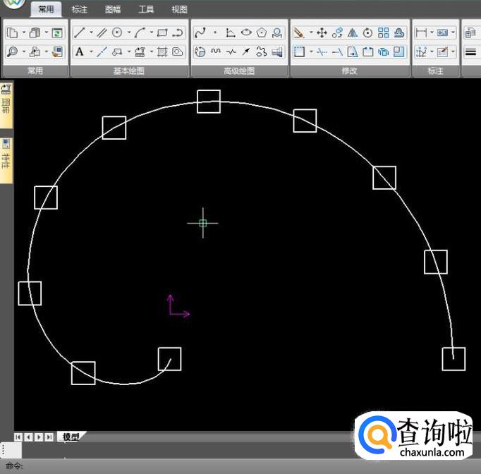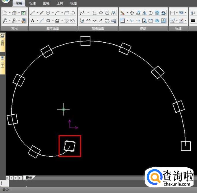 如果在使用曲线阵列命令时选择“旋转”,正方形的方向是会随着曲线的法线方向改变的,效果如图;