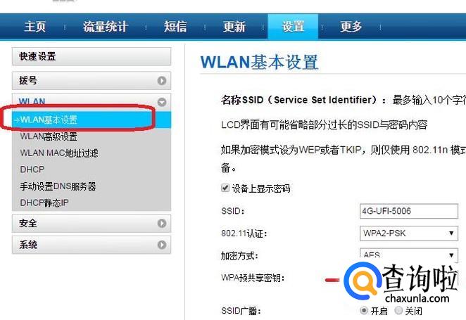 在扩展菜单中选择“WLAN基本设置”,如图所示,只需选上WPA预共享密钥“显示密码”,就可以看到自己设置的WIFI密码了。