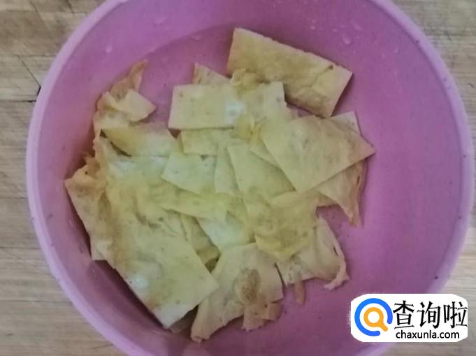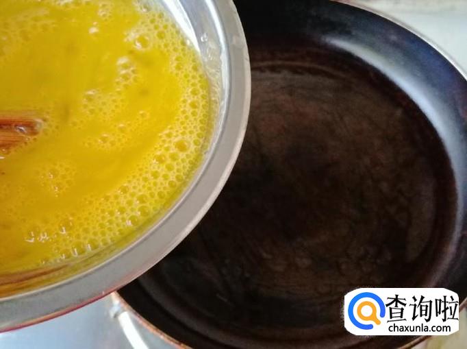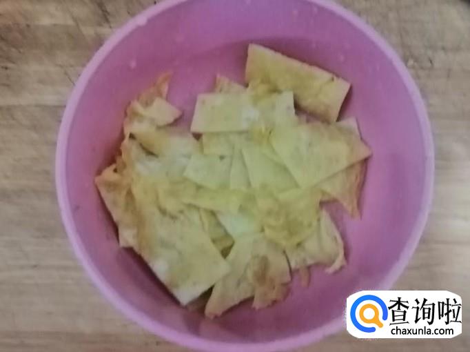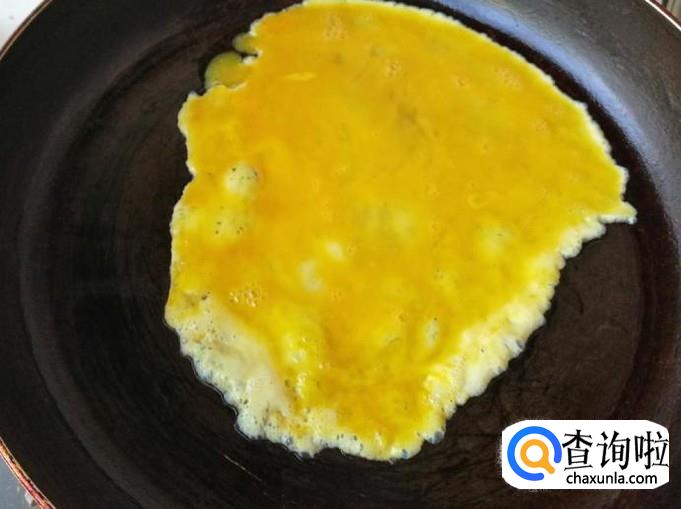 煎过刷少许油,倒进适量蛋液,迅速转动平底锅把蛋液转匀,等蛋液凝固后翻个煎另一面,煎好后放在菜板上切好待用。