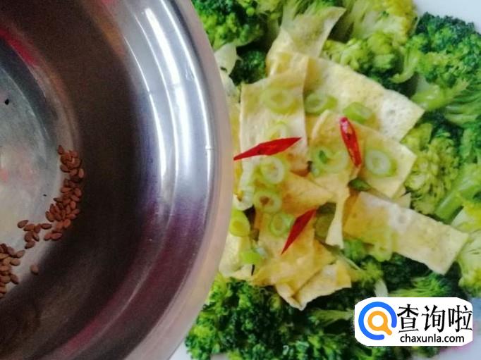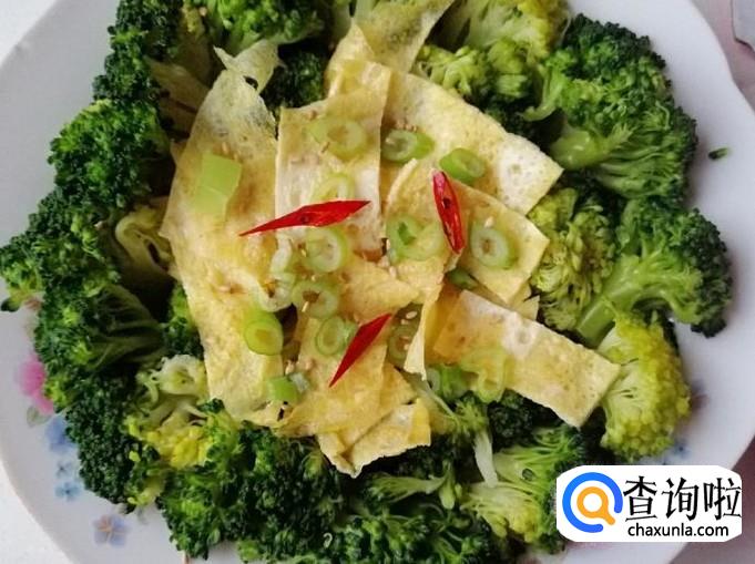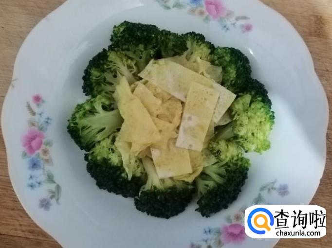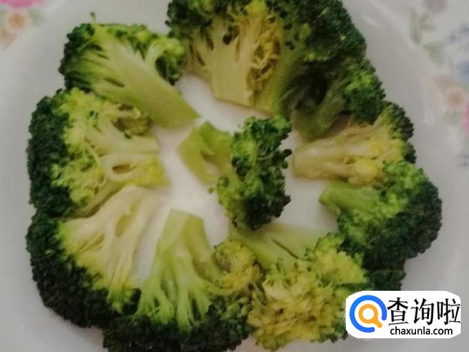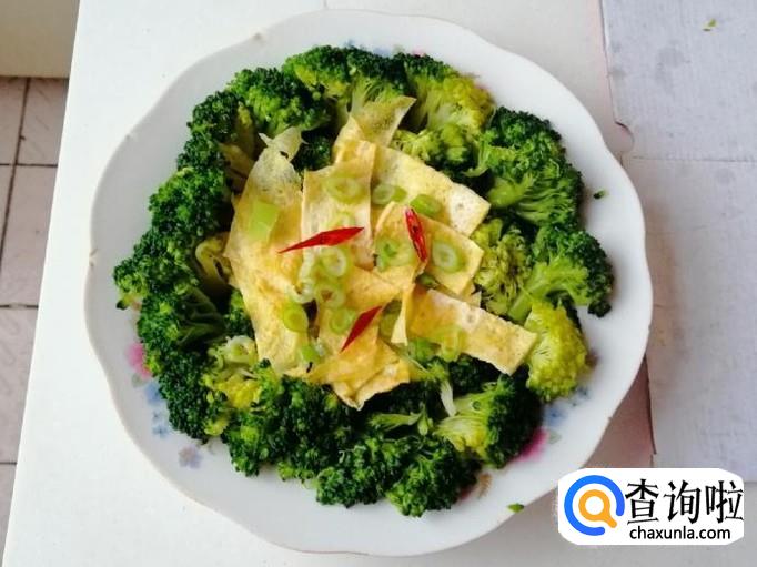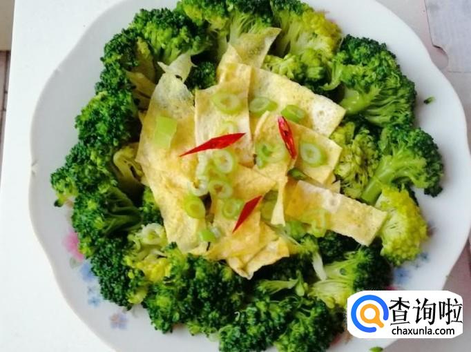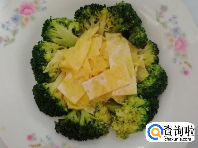 今天心情好,把西兰花摆一下盘,如图放好西兰花后,加入切好的鸡蛋饼摆放在盘子的中间就可以了。