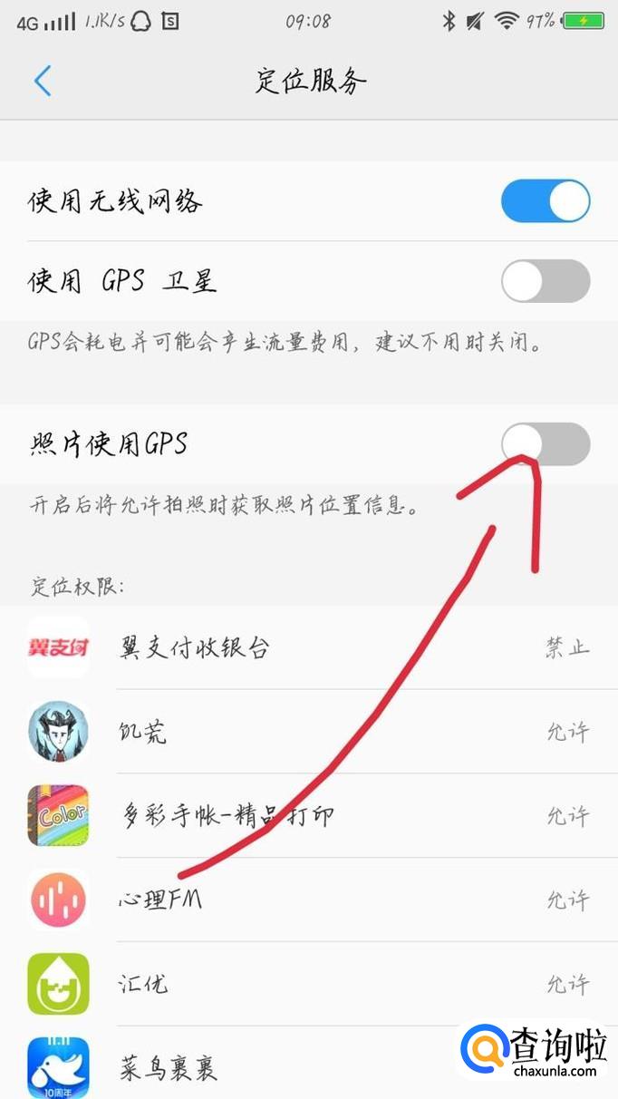 你会看到进入一个新的界面,你可以点击“照片使用GPS”选项,如图1箭头所示。开启后将允许拍照时获取位置信息。