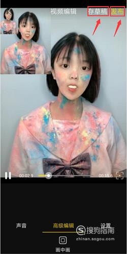 返回视频编辑页面后,可点击“存草稿”将视频保存至本地,也可以点击“发布”快速分享给好友。