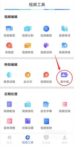 在视频工具页面的特效编辑模块中,找到并点击“画中画”,进入视频导入页面。