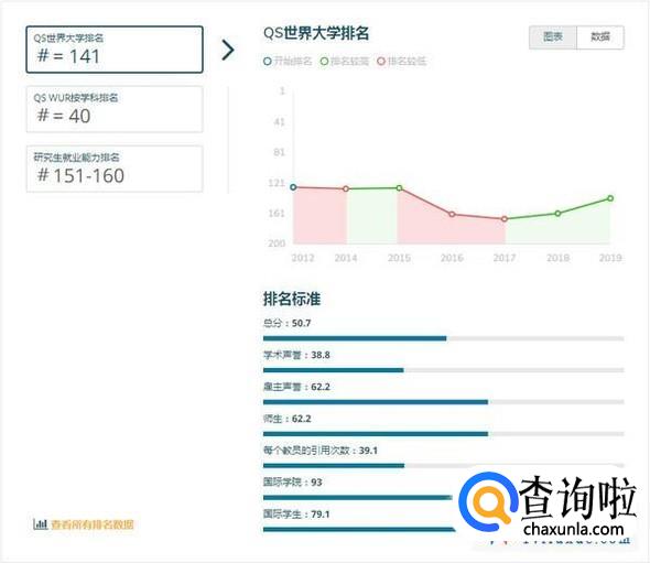 注:QS世界大学排名是世界公认最具影响力的全球性大学排名之一,主要评价指标为:学术领域的同行评价(40%)、全球雇主评价(10%)、单位教职的论文引用数(20%)、教师/学生比例(20%)、国际学生比例(5%)、国际教师比例(5%)