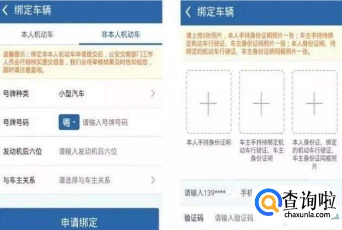 绑定条件:只允许申请绑定本人名下车辆和1辆非本人名下机动车;绑定的必须是个人名下机动车,且必须是小型汽车或小型新能源汽车。