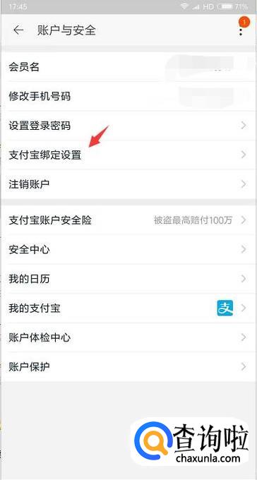 账户与安全里第四个就是支付宝的绑定设置,我们点击进入。