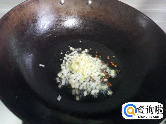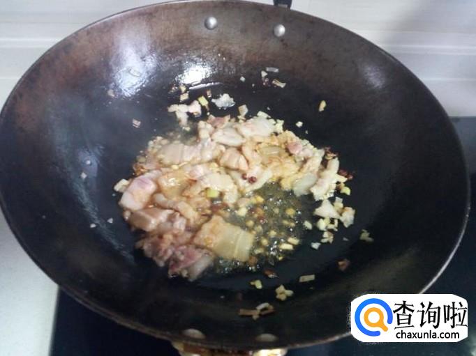 锅内放入油加热,油热后放入花椒,葱,姜,蒜,爆锅,然后放入肉翻炒。放入少许料酒,酱油。