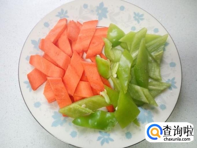 胡萝卜,青尖椒,用水洗净,切成薄片。切好葱,姜,蒜,备用。