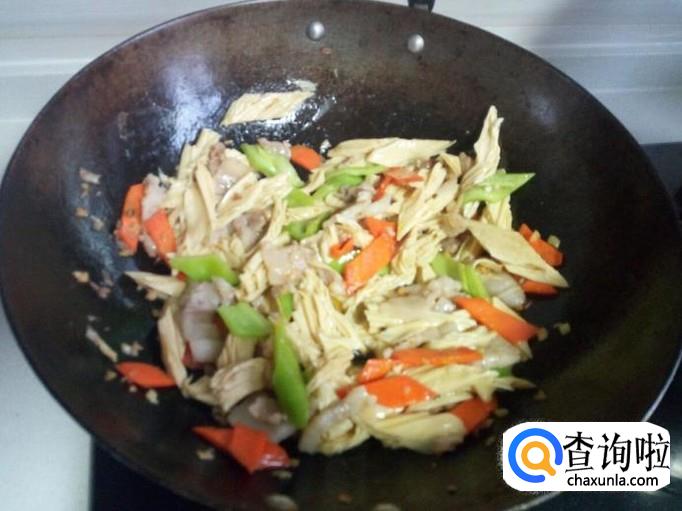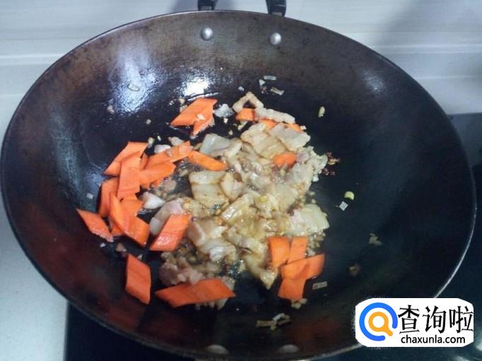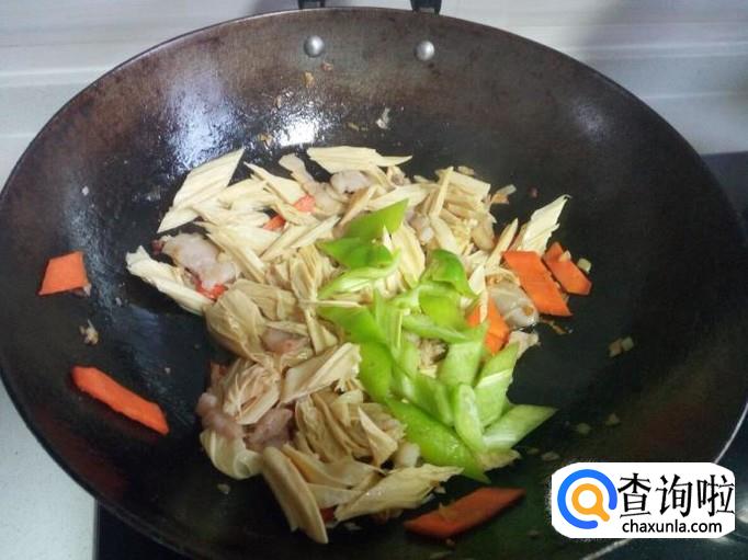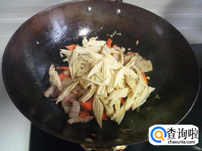 炒至肉变色,放入胡萝卜片,炒至变软。放入腐竹,快速翻炒,放入盐。