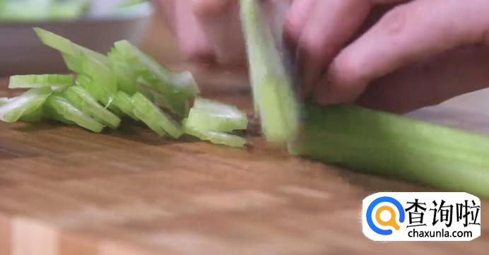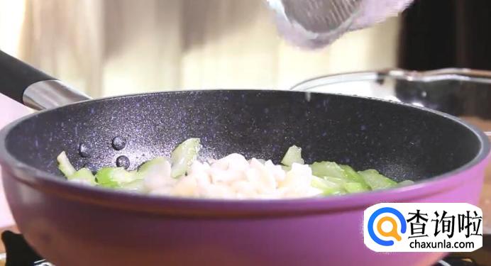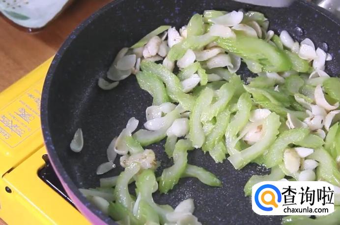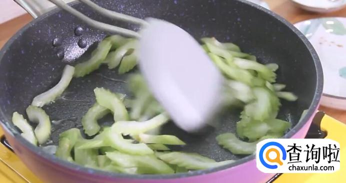 锅内倒入少量的油,将西芹倒入锅中煸炒出香味。