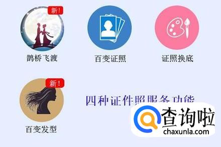 接着就进入到了这款小程序的主页,首页共有四种功能,分别是鹊桥飞渡、百变证照、证照换底以及百变发型,如图所示...