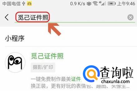接下来在微信小程序首页右上角点击放大镜图标,然后搜索“觅己证件照”;