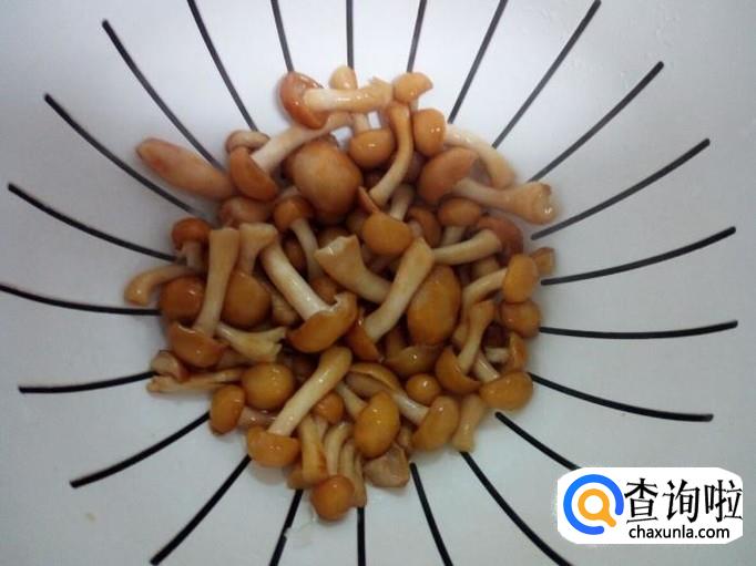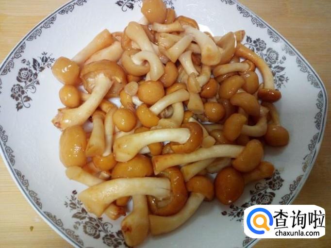 滑子蘑用水焯一下,水开后入锅10秒钟捞出,用冷水过凉,沥干水分。