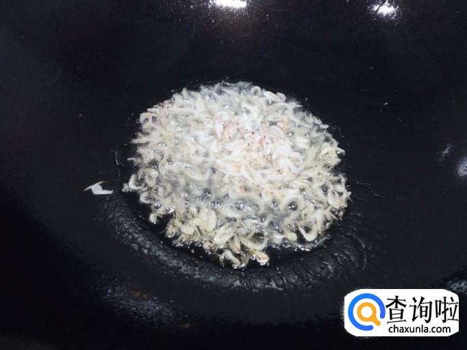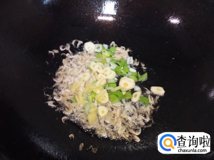 锅内重新放入油加热,油热后放入虾皮小火翻炒,炒至虾皮出香味,放入葱,姜,蒜翻炒。