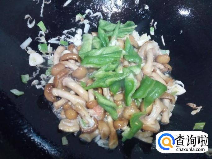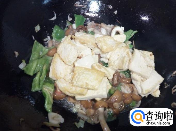 随即放入滑子蘑转大火翻炒。滑子蘑稍翻炒一下,放入青椒翻炒,青椒翻炒至断生,放入煎塌好的豆腐。