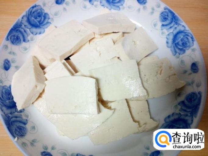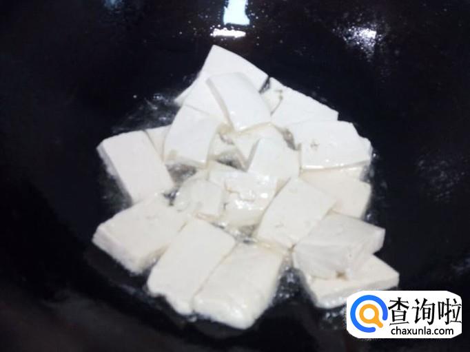 锅内放入油加热,油热后放入豆腐,小火煎塌,煎塌至表面微黄,盛出备用。