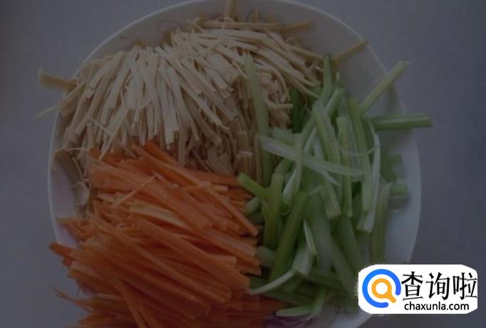 将芹菜,胡萝卜,豆腐皮洗净,分别切成丝,装盘备用