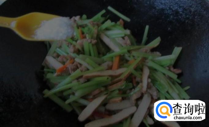 然后我们加入胡萝卜丝,芹菜丝,豆腐皮丝,炒2分钟,加盐,味精,花椒面,炒匀,起锅