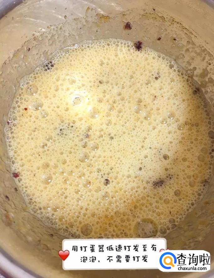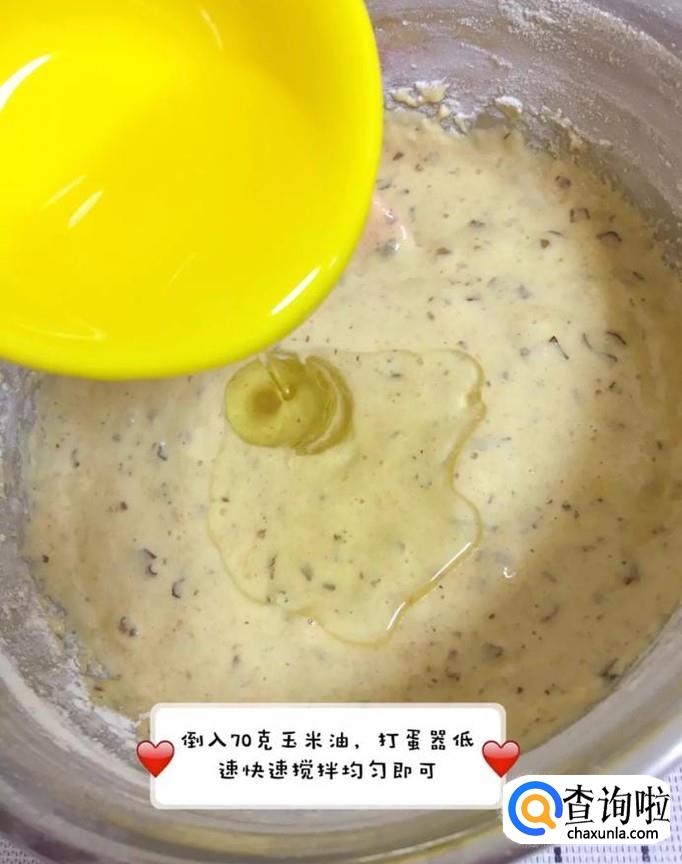 接着倒入70克的玉米油,用打蛋器搅拌均匀,如下图所示。