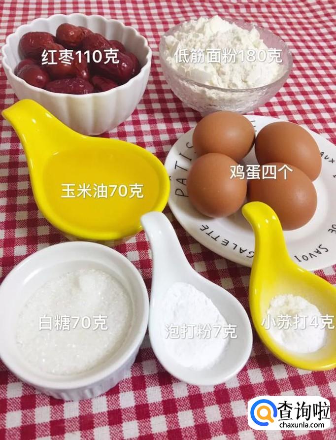 首先准备好所有要用到的食材,如下图所示。小贴士:红枣110克,玉米油70克,白糖70克,泡打粉7克,小苏打4克,鸡蛋四个,低筋面粉180克。
