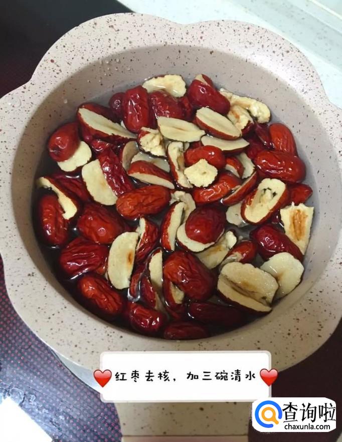 然后将红枣去核,倒入锅中煮半个小时,如下图所示。