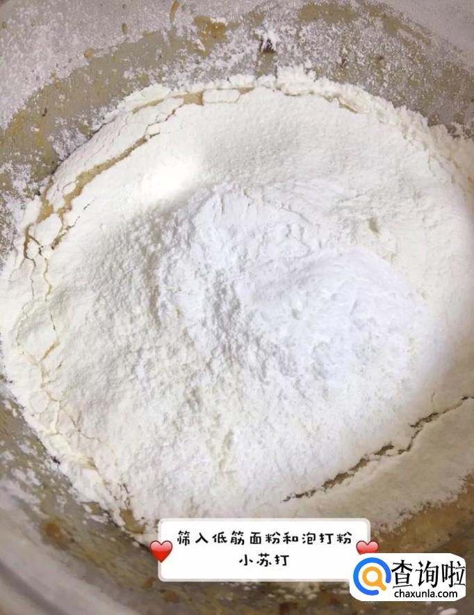 然后筛入低筋面粉、苏打粉和泡打粉,搅拌均匀,如下图所示。