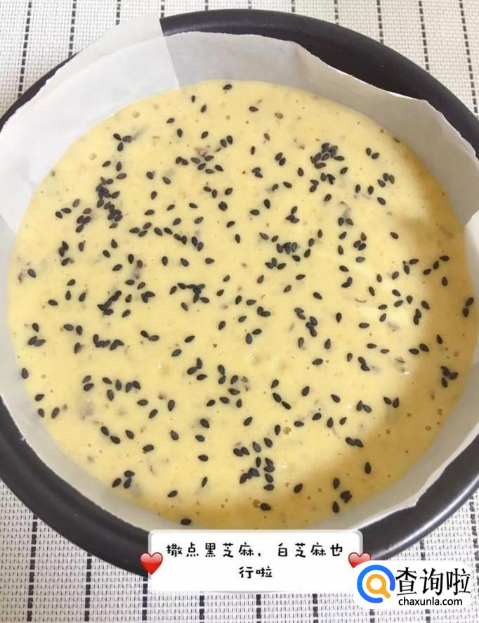 然后把面糊倒进模具,撒上黑芝麻,如下图所示。