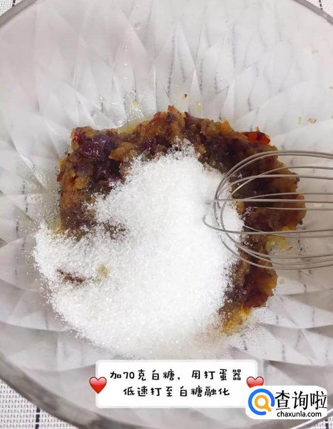 接着在煮烂的红枣泥中加入70克的白糖,用打蛋器低速打至白糖融化,如下图所示。
