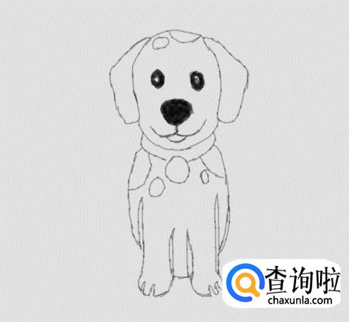 在小狗的头部下面画出小狗的身体和两条腿前腿及脚掌,如图所示: