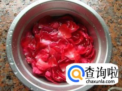 把新鲜玫瑰花取花瓣放水里漂洗干净,捞出放漏盘里晾干水份。