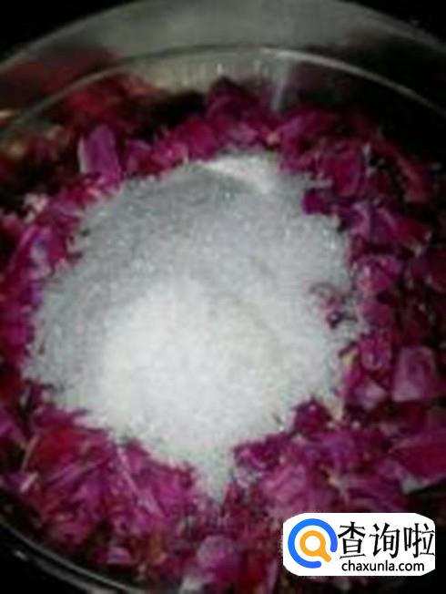 把蒸好的玫瑰花倒入一个小盆里,给盆里加入5勺白糖,和5勺蜂蜜。