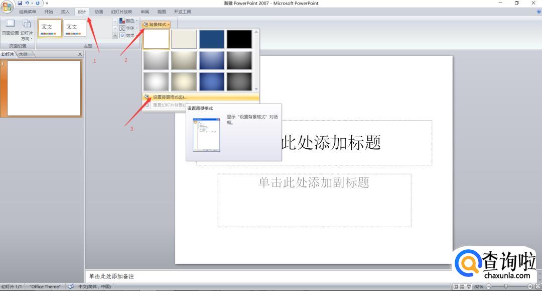打开PPT后选择任务栏上的【设计】,找到右边的【背景样式】,再选择下方的【设置背景格式】。