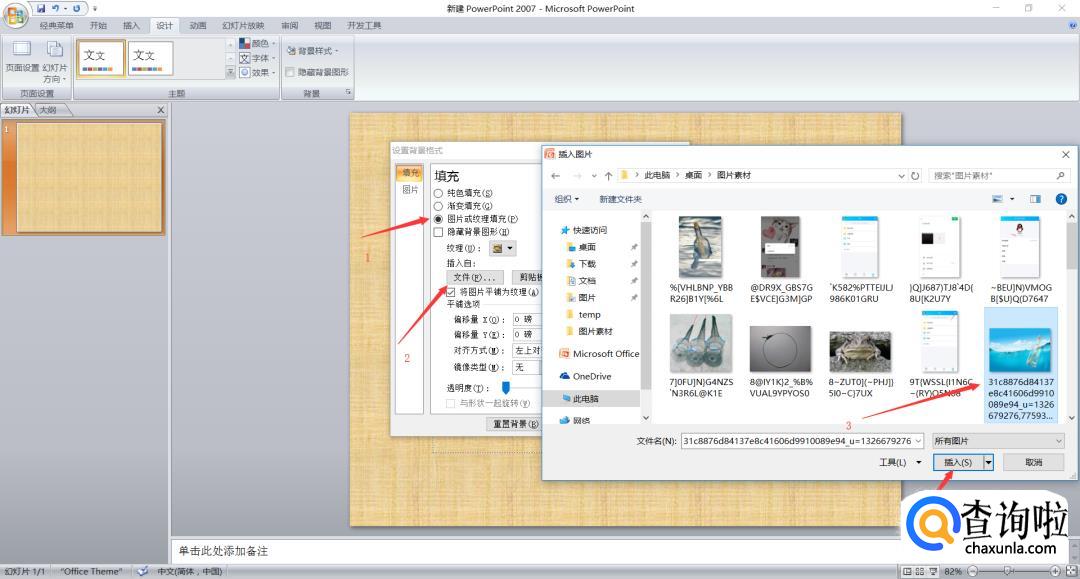 在弹出的对话框中我们点黑【图片或纹理填充】,点击下方的【文件】,在弹出的对话框中找到准备好的素材,再点击插入。