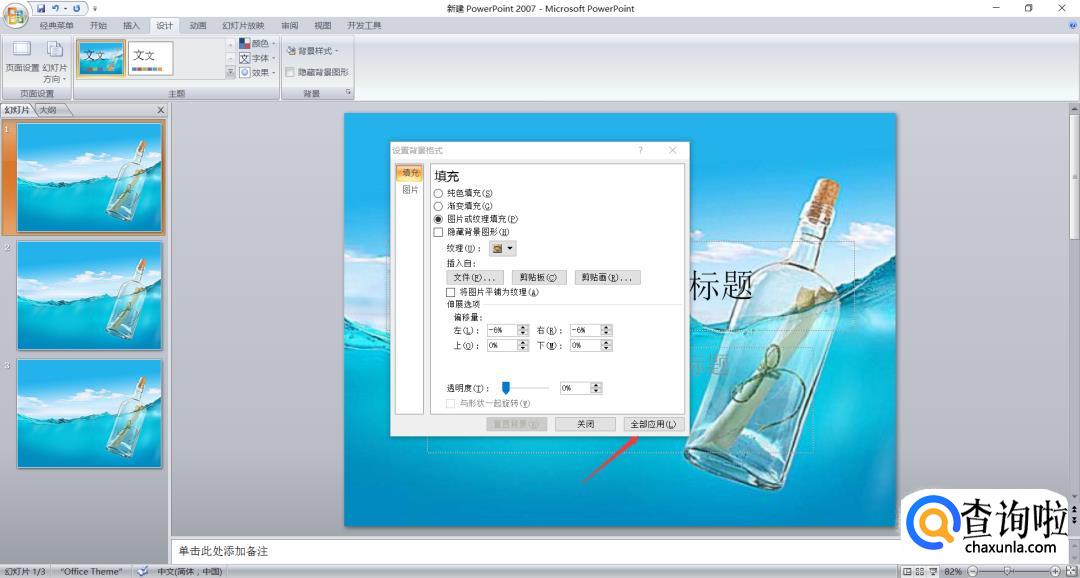 接着我们可以按照刚才的操作步骤到【图片或纹理填充】,再选择全部应用,这时候所有的背景都换成了自己的图片素材。是不是很简单?