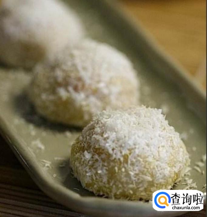 把已经包好的芒果糯米糍放入事先准备好的椰蓉里面,然后再把全部包好的糯米糍放入盘子里面摆好就可以了。