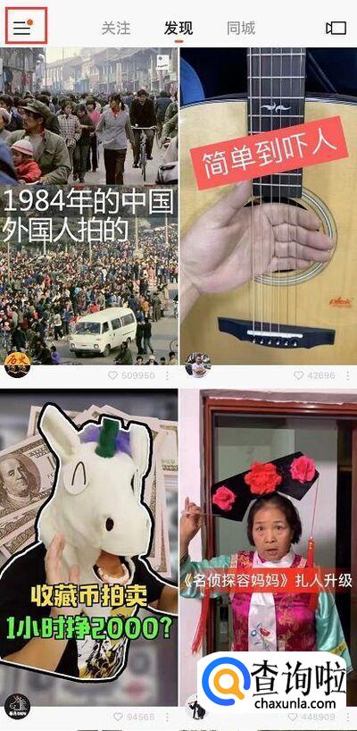 首先,打开快手APP,进入首页,然后点击右上角三个横线的按钮,打开侧边窗扣。