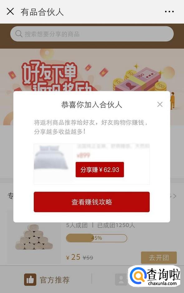 加入合伙人成功以后,会弹出恭喜窗口,点击“查看赚钱攻略”;