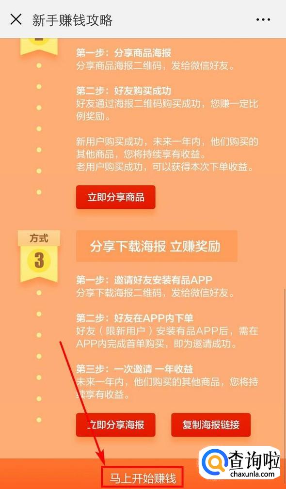 有三种方式,自行浏览一下,总结一点就是需要分享,点击下方的“马上开始赚钱”;