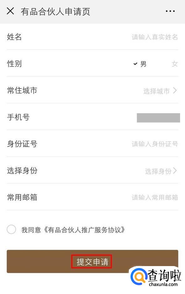 进入到“有品合伙人申请页”,填写所需要的信息,点击“提交申请”;