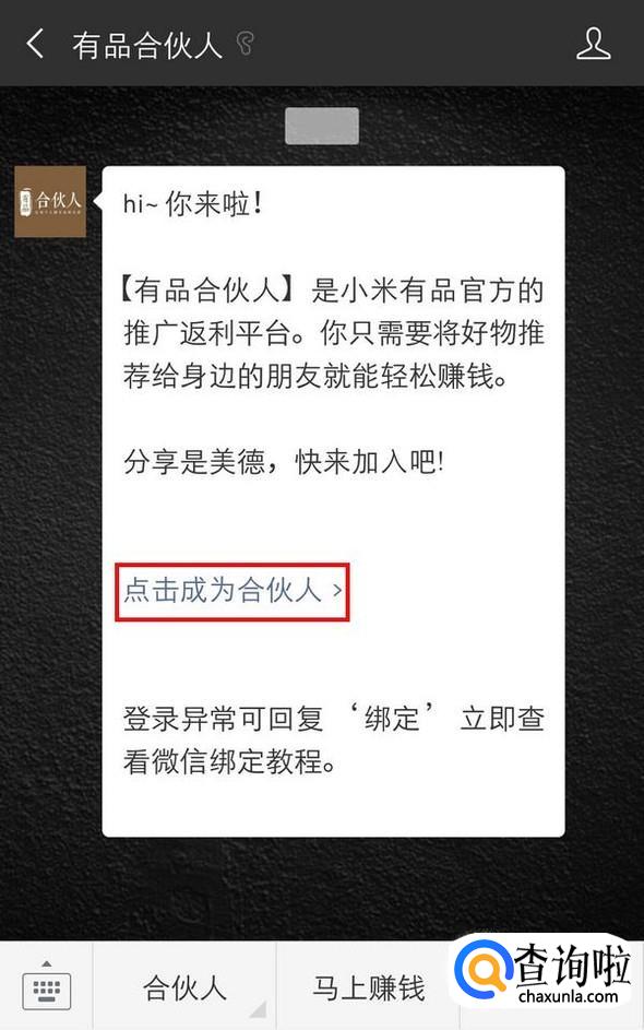 首先微信中关注公众号“有品合伙人”,首次关注会收到一条消息,其中可以“点击成为合伙人”;