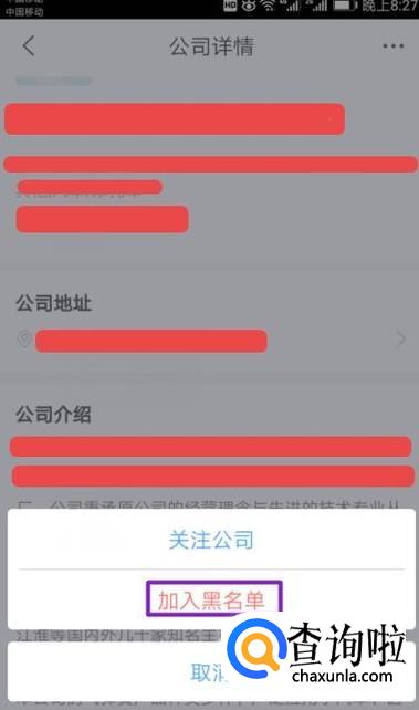弹出的界面,我们点击加入黑名单,这样就不会让该公司查看到我们自己的简历了。
