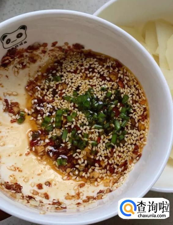 倒入之前做好的蘸料中,再加一点酱油、葱花,拌匀,就可以吃了。