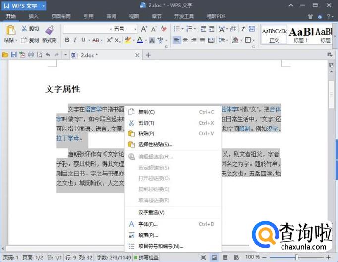 如果“删除键”不管用,那么说明是文本设置更改了,我们需要设置文本格式。首先选中空白行出现的文本段落,点击右键,打开菜单。