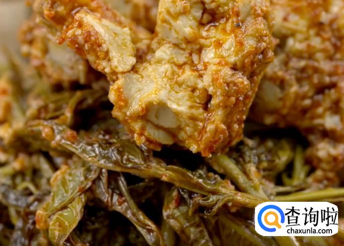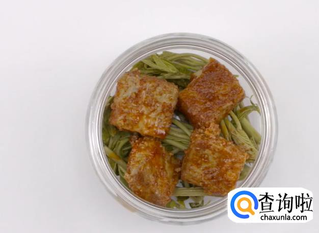 之后在容器中逐层平铺香椿、腐乳。