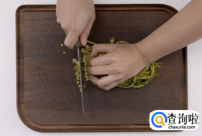 首先把焯水晾干的香椿切碎。