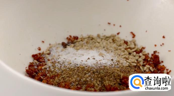 接着混合辣椒粉、花椒粉、芝麻和盐。
