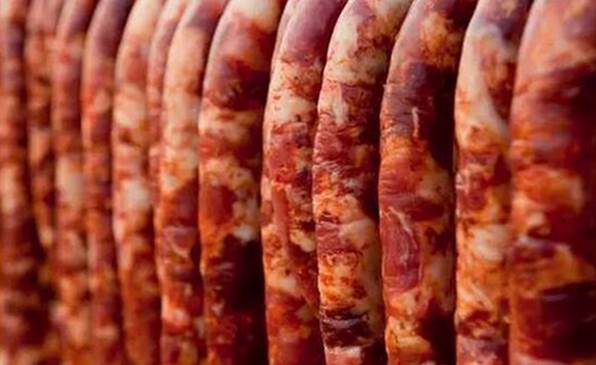 第三步:七天之后,我们就可以将盆里的香肠拿出来,然后往香肠上边扎几个小孔并将其挂在干躁且自然通风的位置进行风干,需要挂三天时间,三天之后再将香肠挂到太阳比较弱的地方晒上一个礼拜。