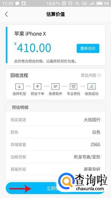 估价之后即可查看相应的估算价值信息,如果要确定回收的话,点击“立即回收”就可以回收了。