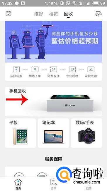 进入回收界面,我们能够看到多种数码产品的回收选项,点击“手机回收”